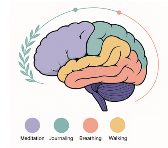 Slow, intentional breathing significantly modulates brain activity, particularly in the medial prefrontal cortex, crucial for emotional regulation and executive functioning. Mindful breathing activates the parasympathetic nervous system via the brainstem and vagus nerve, reducing heart rate and cortisol, and inducing a state of calm. Best practises in the literature suggest slow-paced breathing exercises and a personal favourite, the Wim Hof Breathing Technique.
